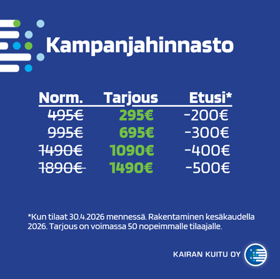 Normaalihinta 995 € / kampanjahinta 695 € – koskee kohteita, joissa tarvitaan maanrakennustöitä ja rakennettava matka on alle 40 metriä lähimmästä liityntäpaikasta.