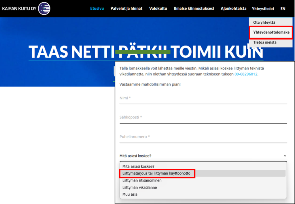 Liittymätarjouksen voi tilata Kairan Kuidun verkkosivuilta www.kairankuitu.fi oikeasta yläkulmasta à Yhteystiedot ja sieltä Yhteydenottolomake – Liittymätarjous tai liittymän käyttöönotto. Toinen vaihtoehto on toimittaa vastaavat tiedot sähköpostilla osoitteeseen info@kairankuitu.fi . Toimitamme aina tarjouksen kirjallisesti, mieluiten sähköpostilla.
